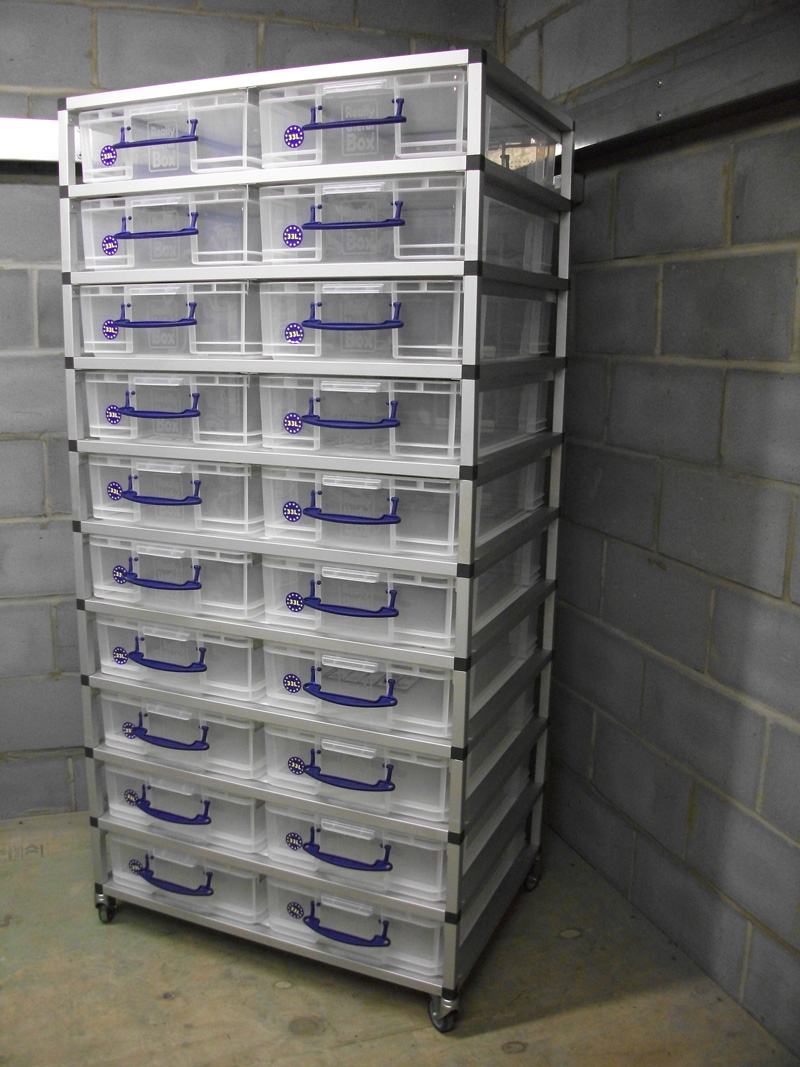 This is the replacement system for the large Contico tub, utilising the 33 ltr Really Usefull tub. Available in sections as detailed below or as a complete system ready to go. Start your system with a castor base and then mix and match with either the single, double or triple levels to build a complete bespoke system. If you require a mix of any of the other systems to create a multi size system- please call as we can usually accomodate