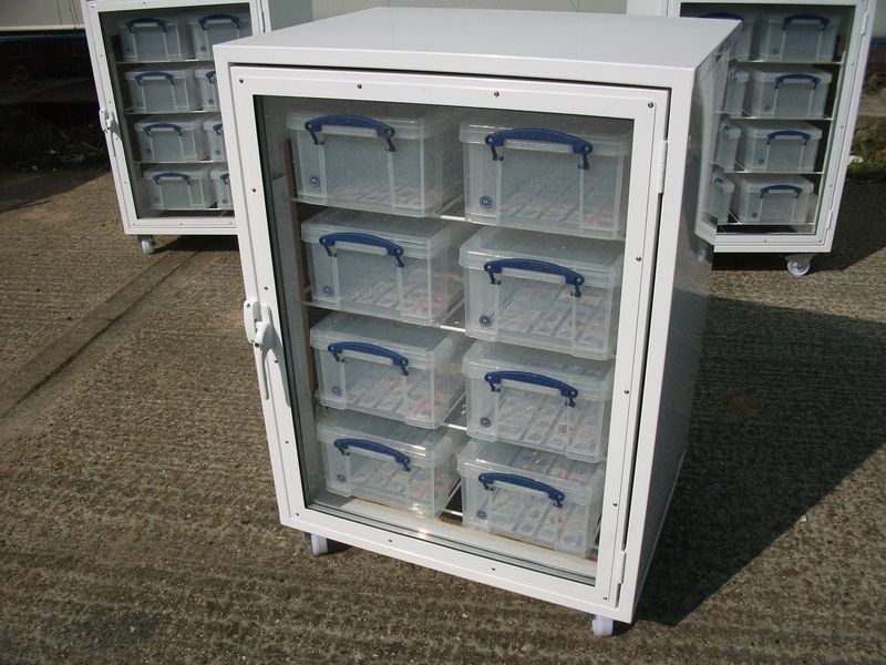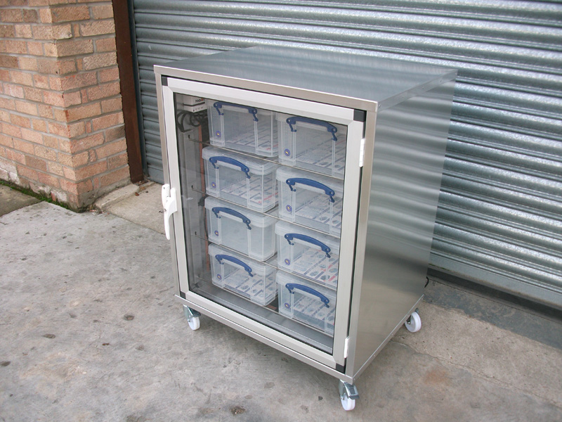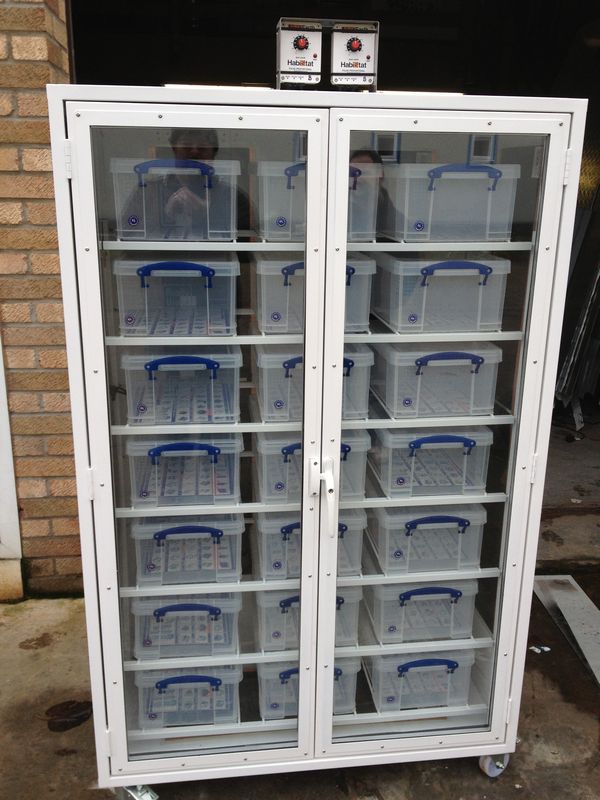 We have continued to develop this great range of professional quality incubators over the past couple of years culminating in the aluminium units pictured below. Being snake breeders ourselves we are only too aware of the value of the clutches that are produced toaday so we use tried and tested Habistat pulse proportional stats controlling heat mats to maintain the tempreture. There may be more elegant heating options available but we have found that this system is the most reliable and with contents valued in the 10s of thousands, reliability is of the upmost importance. We produce a standard range as deailed below but are also able to build to your exact requirements as the 20 tub unit at the bottom of the page testifies.